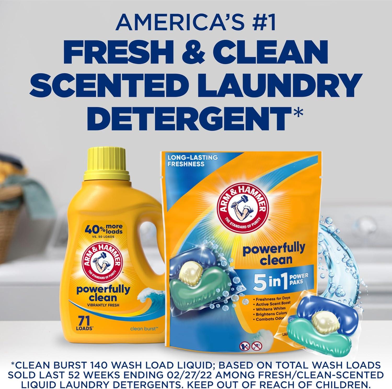 Capture the cleaning power of ARM & HAMMER Clean Burst 5-in-1 concentrated laundry detergent Power Paks with an amazing Clean Burst scent. This ARM & HAMMER laundry detergent delivers five powerful cleaning benefits in one: gives your clothes freshness for days, whitens whites, brightens colors and combats odors, with an active scent boost that leaves your laundry smelling clean and fresh. Packaged in convenient, pre-measured Power Paks that blast away tough dirt and stains for a powerful, efficient, and long-lasting clean. The convenient, concentrated laundry detergent Power Paks mean there’s no measuring, no mess and no spills. Super easy, super powerful: use one pak for regular or lightly soiled loads, and two paks for large or heavily soiled loads. This concentrated laundry detergent cleans in all temperatures, and works in both standard and high efficiency (HE) washing machines. Drop a pak or two in your washer and get your clothes ARM & HAMMER Clean Burst 5-in-1 clean and fresh!