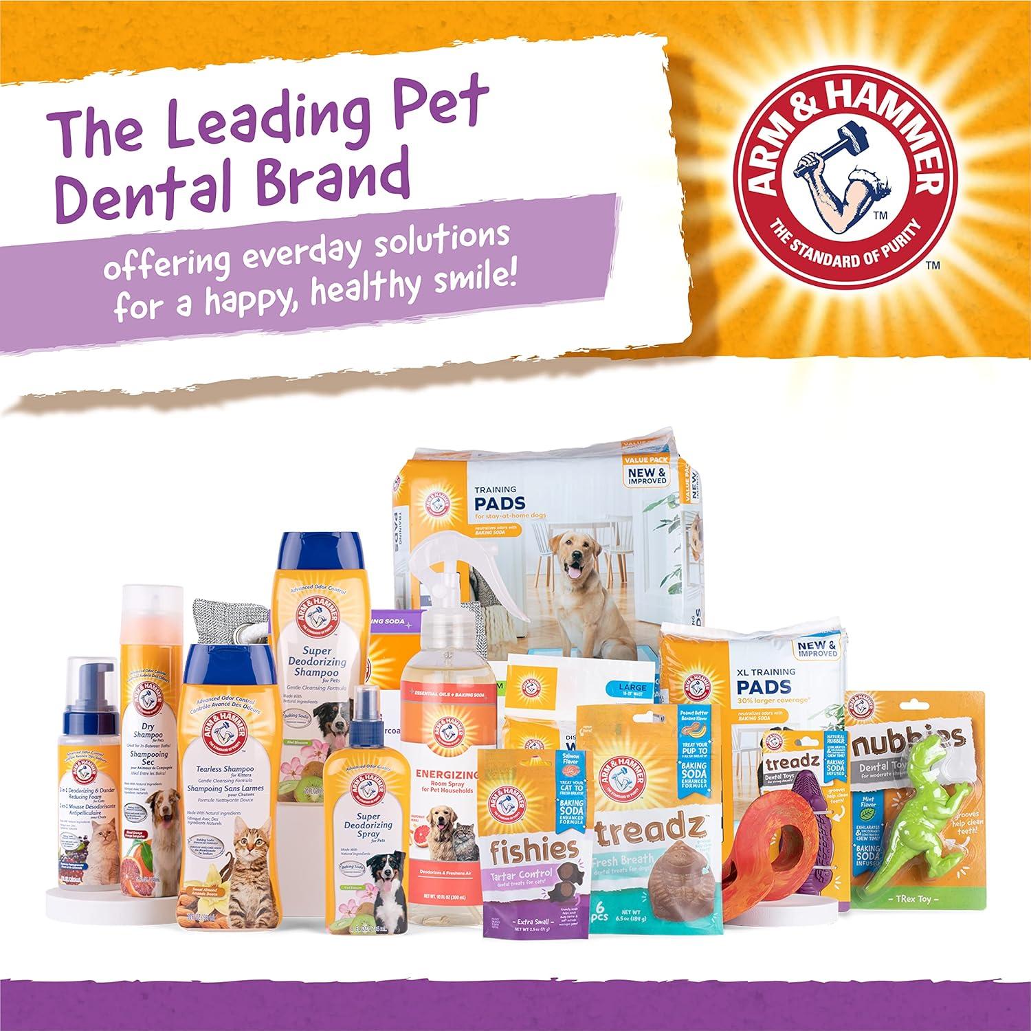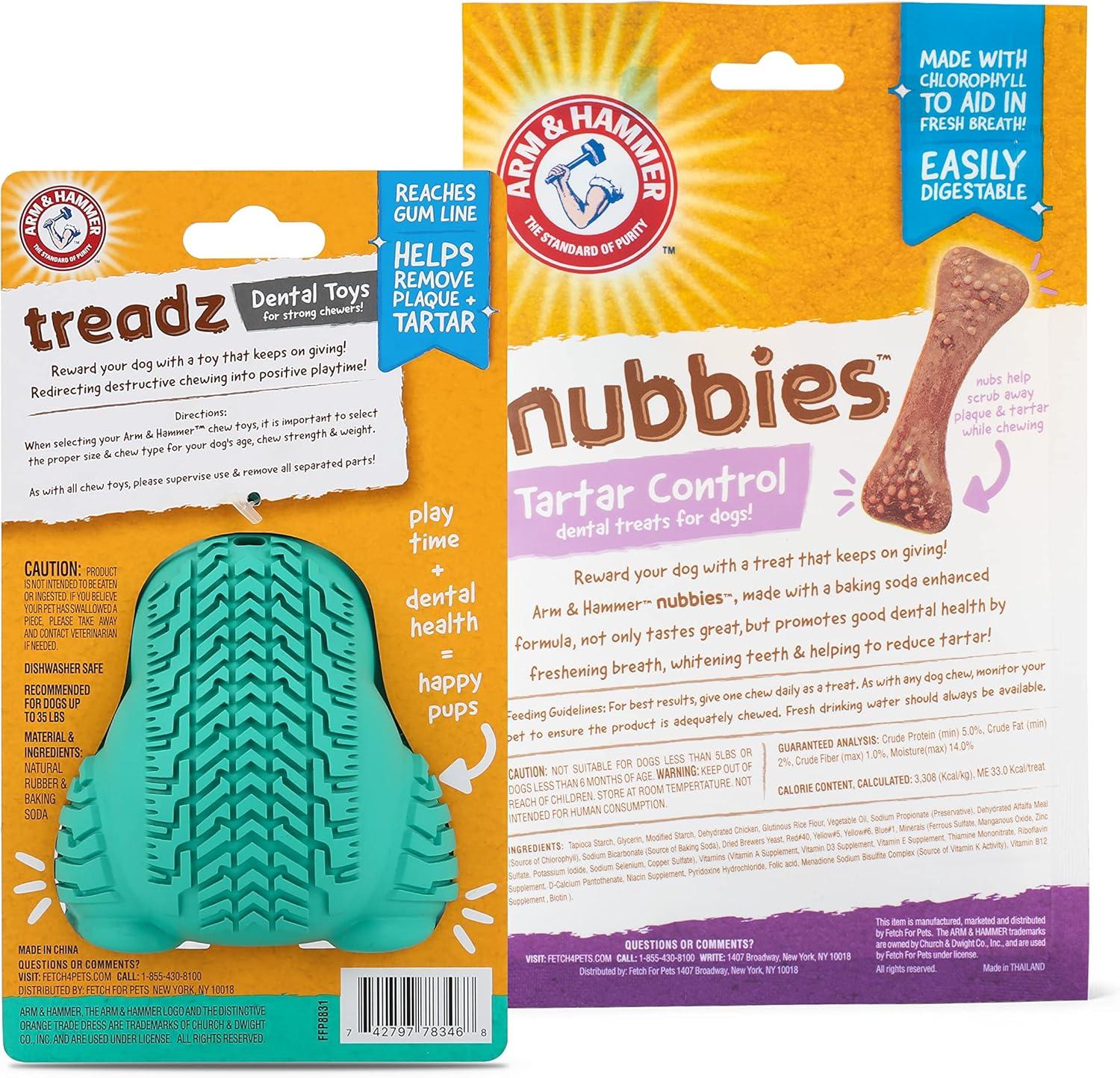 The Arm & Hammer Super Treadz Dental Dog Toy helps keep your dog's teeth clean while he plays. These toys are the ultimate, durable dental toy for your pet. They are specifically designed to help freshen breath, stimulate gums, and reduce tartar and plaque buildup while the extremely durable body withstands even the most aggressive of chewers. These adorable and beneficial toys are sure to keep your pup busy for hours while the baking soda infused rubber body works to gently clean and freshen their teeth. INGREDIENTS: Natural Rubber and Baking Soda . WARNING: As with all chew toys, please supervise use and remove all separated parts. Product is not intended to be eaten or ingested. Please contact your veterinarian or take away. Do not use with dogs larger than 35 lbs. Dog dental toys like this dog toy is a great item of dog stuff. Puppy toys, dog toys, dog dental toys ,dog toys for aggressive chewers, puppy teething chew toys, interactive dog toys, and dog chew toys for aggressive chewers like these are interactive dog toys that could be part of a dog tooth brushing kit. Add to your dog grooming supplies with this dog dental care product and get fresh breath for dog. Toys for dogs like this dog toy could be dog squeaky toys for big dogs or small dogs depending on the size of the toy. Interactive dog toys like this dog chew toy can be useful for dog teeth cleaning and dog oral care. YOUR SATISFACTION IS OUR PRIORITY*: If you have any questions or feedback, please email us.
