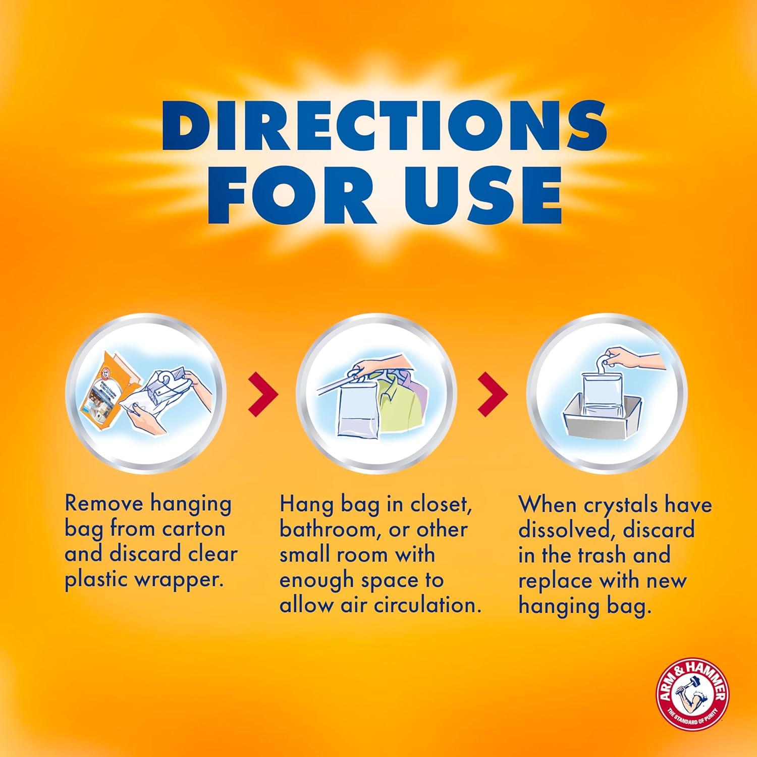 Arm & Hammer Hanging Moisture Absorber and Odor Eliminator Bags are non-electric dehumidifiers that keep your small rooms and closets smelling fresh. These hanging dehumidifier bags eliminate musty odors and freshen air with the power of baking soda. They offer 15% more moisture absorbing power compared to the leading brand. Long-lasting freshness – up to 60 days depending on temperature and humidity. These humidity absorber bags are ideal for closets, laundry rooms, mud rooms, bathrooms or anywhere excess moisture and stagnant air are a nuisance. Just hang them up, no electricity required. When the bag is full of water, dispose in trash and replace with a fresh one. Not for use in moving vehicles. Keep out of reach of children. Do not allow product to contact leather or metal.
