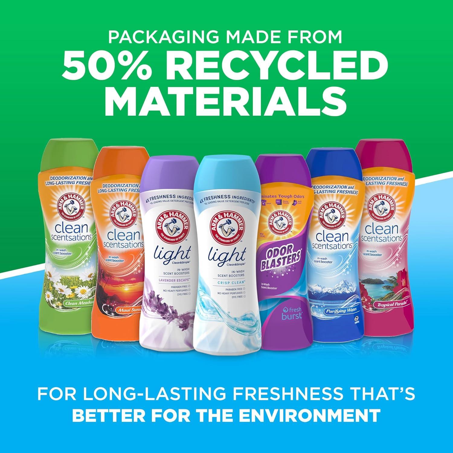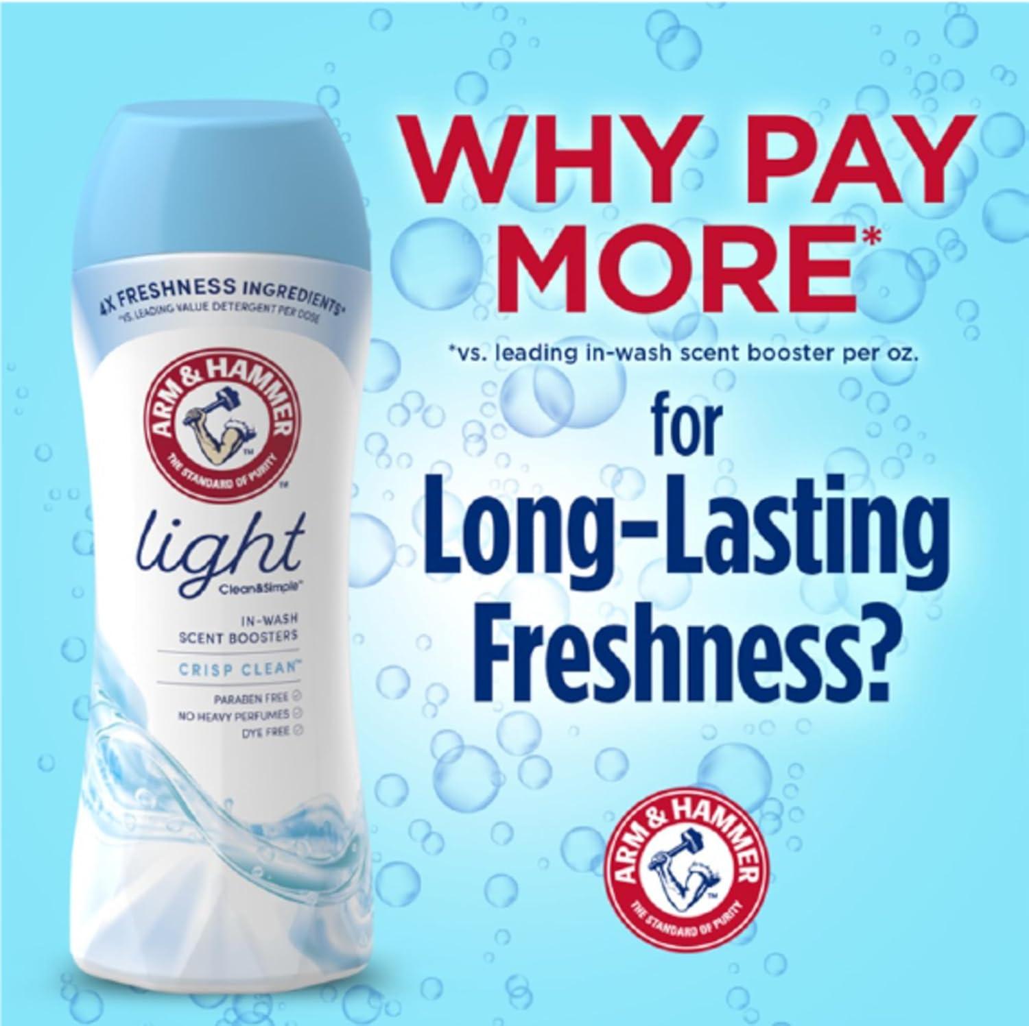 Freshen every load without heavy perfumes when you add ARM & HAMMER Light InWash Scent Booster to every load. Unlike other laundry scent boosters, it delivers a light yet long-lasting Crisp Clean scent with 4X the freshness ingredients vs. the leading value detergent per dose. Its sparkling blend of watery fruits, crisp morning dew, and delicate blossoms leaves clothes smelling wonderfully fresh and clean with a botanical effect. These laundry crystals are made with just 4 essential ingredients—crystallized minerals, pure ARM HAMMER Baking Soda, a non-sticking agent, and a crisp and clean light fragrance–but contain no heavy perfumes, no dyes, and no parabens. ARM HAMMER in-wash scent crystals dissolve in cold water, and work in HE and standard laundry machines. This laundry scent booster is safe for all colors, machine-washable fabrics, and load types. To use, simply fill the cap and pour into your washer drum, add clothes, add regular detergent, and wash per label directions. For a complete clean with lasting light freshness, use this light laundry scent boosterwith ARM HAMMER laundry detergent liquid or Power Paks.
