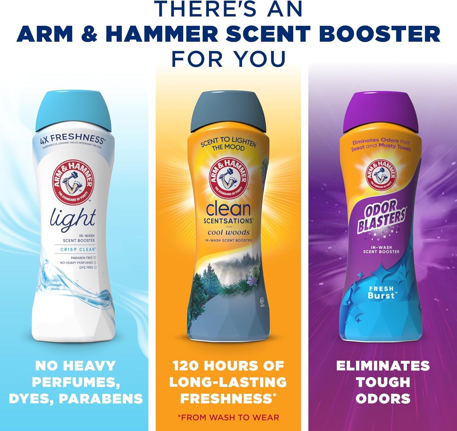 Use the complete ARM & HAMMER Odor Blasters line with in-wash scent boosters, dryer sheets, and ARM & HAMMER laundry detergent to power out dirt and odors, and add a burst of lasting freshness to your entire laundry routine