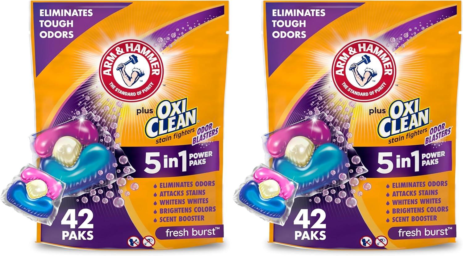 One 42-count bag of ARM & HAMMER Plus OxiClean with Odor Blasters 5-in-1 concentrated laundry detergent Power Paks with an amazing Fresh Burst scent