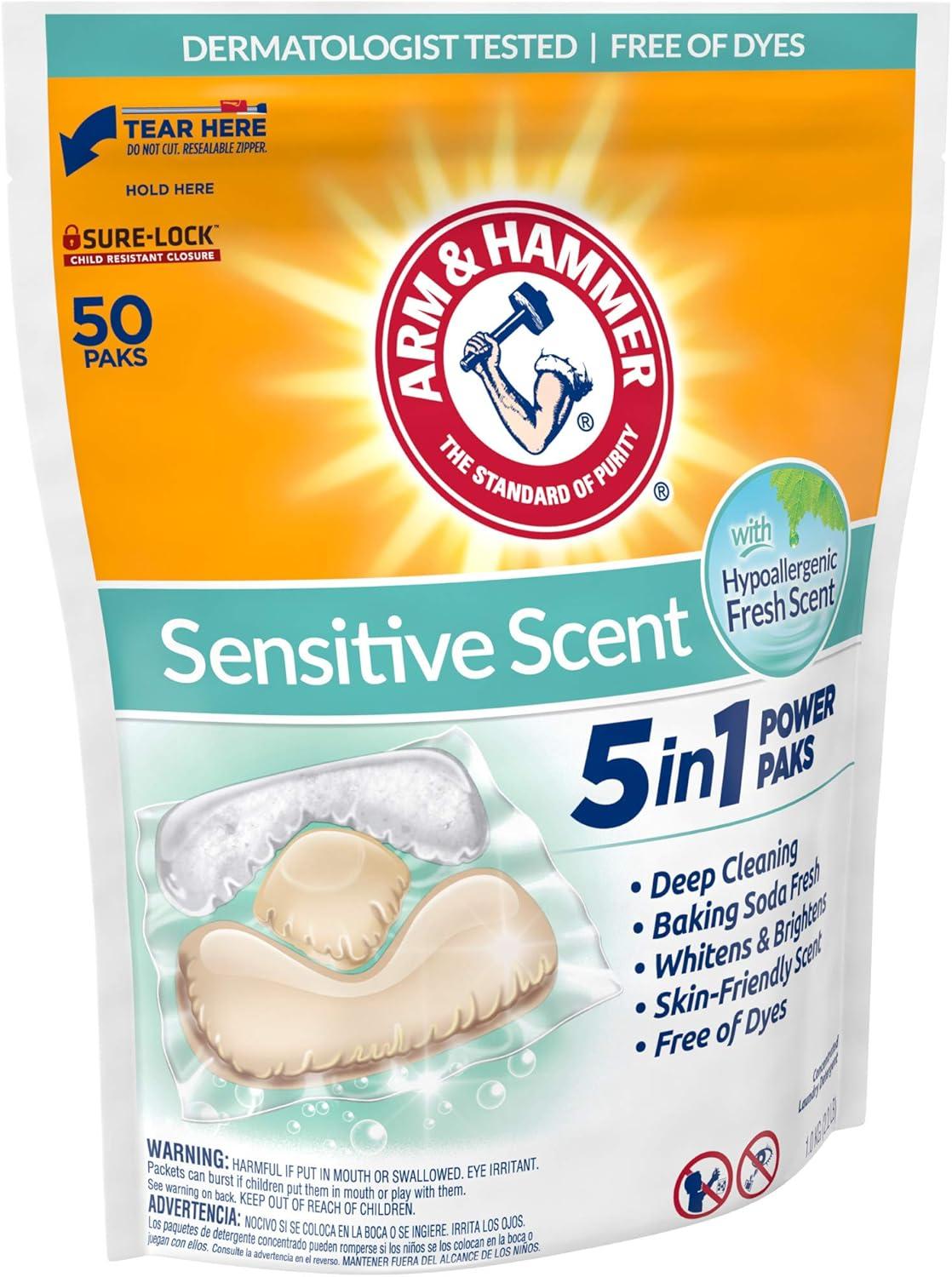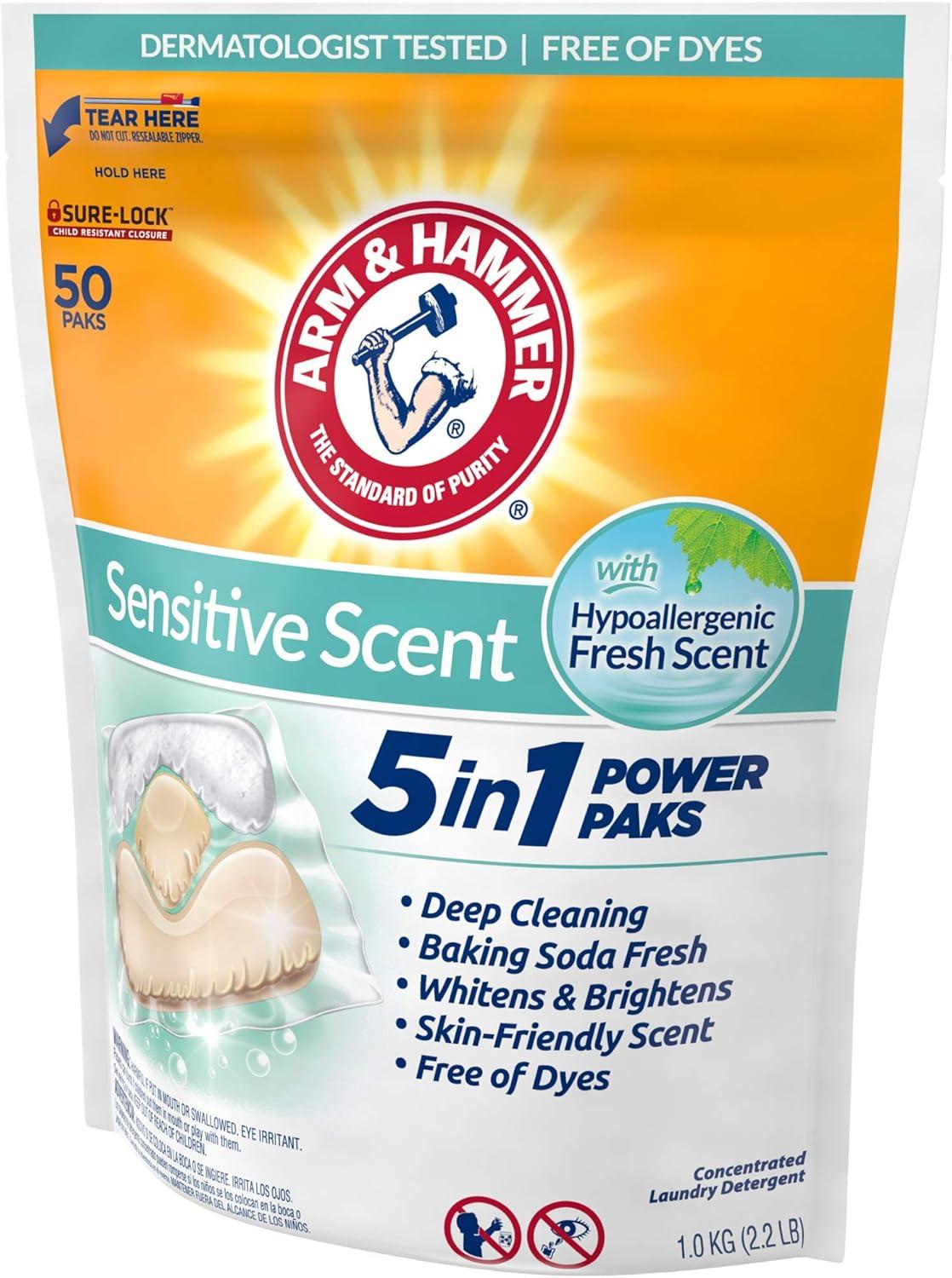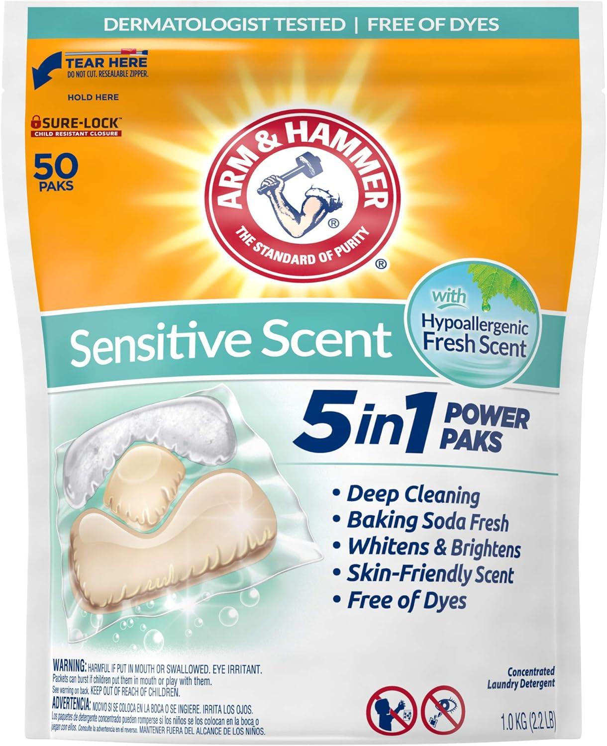 Get a powerful clean plus skin-friendly fragrance with ARM & HAMMER Sensitive Scent 5-in-1 concentrated laundry detergent Power Paks plus hypoallergenic Fresh Scent. ARM & HAMMER Sensitive Scent 5-in-1 laundry detergent delivers five powerful cleaning benefits in one; it deep cleans, whitens whites and brightens colors, adds lasting freshness, is dye-free, and has a skin-friendly Fresh Scent that leaves your laundry smelling crisp and clean. Dermatologist-tested and free of dyes, this concentrated HE laundry detergent is tough on dirt and stains but has a hypoallergenic fresh scent that is gentle on skin. With the trusted power of ARM & HAMMER, Sensitive Scent 5-in-1 Power Paks attack dirt and buildup in your clothes and deliver a burst of skin-friendly freshness. The convenient, concentrated laundry detergent Power Paks mean there’s no measuring, no mess and no spills. Super easy, super powerful: use one pak for regular or lightly soiled loads, and two paks for large or heavily soiled loads. This concentrated laundry detergent cleans in all temperatures, and works in both standard and high efficiency (HE) washing machines. Drop a pak or two in your washer and get your clothes ARM & HAMMER Sensitive Scent 5-in-1 clean and fresh.