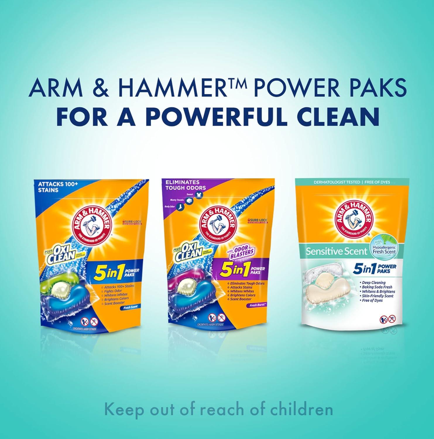 Packed with the trusted power of ARM & HAMMER in convenient laundry detergent Power Paks with a hypoallergenic, skin-friendly fresh scent that delivers a burst of freshness to every load of laundry