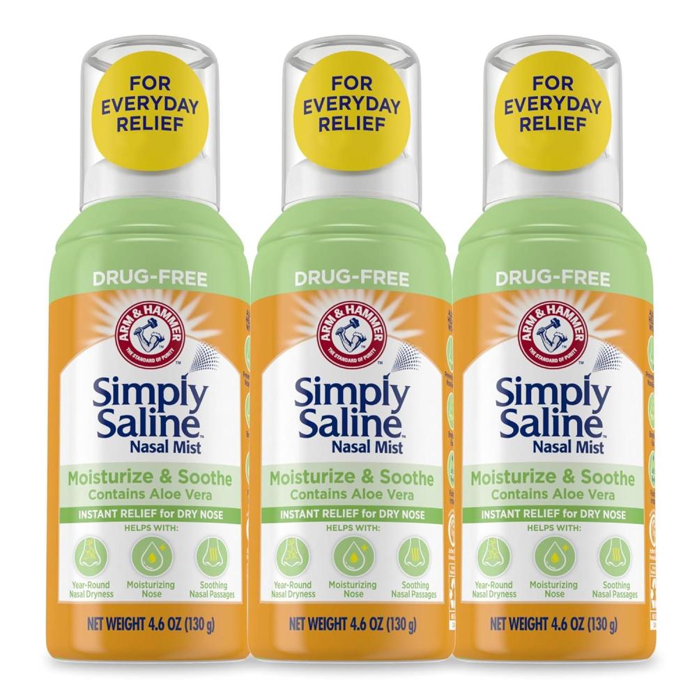 This 3-pack of 4.6 oz (130 g) containers of ARM & HAMMER Simply Saline Moisturize & Soothe Nasal Mist is a drug-free moisturizing saline nasal spray that delivers instant relief for dry nose