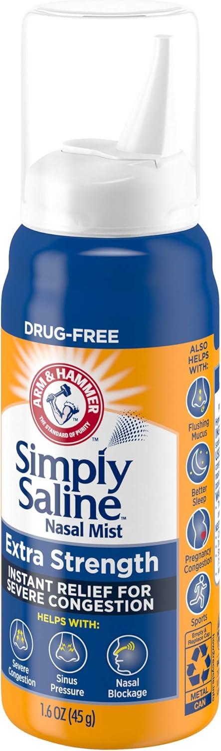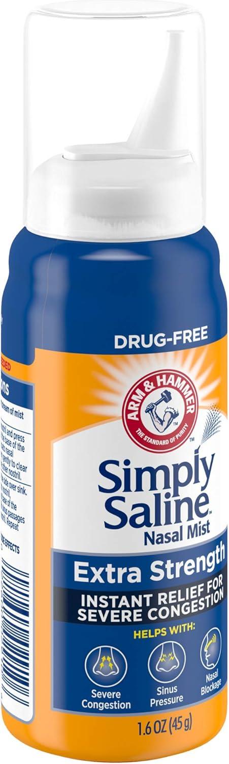 Arm & Hammer Simply Saline Nasal Mist delivers instant congestion relief any time, day or night. Featuring an effective and drug-free formula. The triple strength formula relieves severe congestion & dries runny noses related to allergies , colds, flu, and sinusitis.