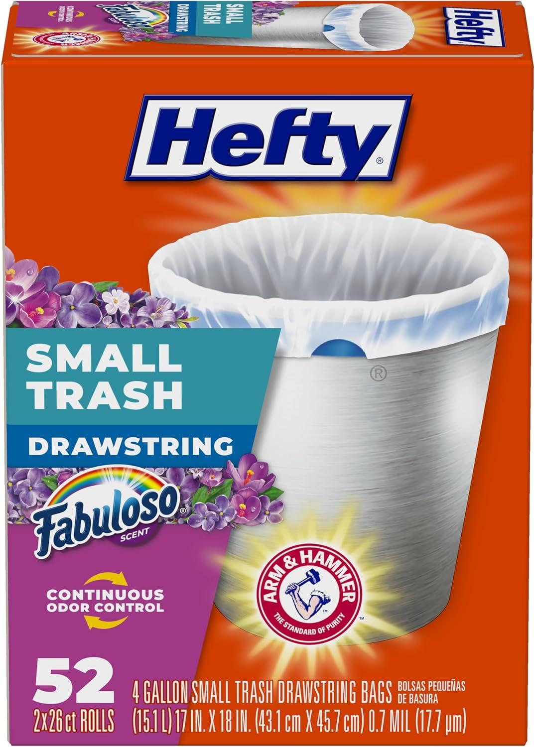 The Hefty strength and reliability you need from your garbage bags, now in a size perfect for those little messes. Hefty Small Trash Bags are the ideal size for small cans all throughout your home: bathrooms, bedrooms, home office and more. And, with the power of ARM & HAMMER odor neutralizers, these Fabuloso scented trash bags will keep any room smelling fresh. A durable drawstring closure helps keep trash inside the can and off the floor during bag removal and closure, so you can take out the trash with confidence. Whatever small messes life throws at you, you can count on Hefty Trash Bags to help you clean it up. Don’t forget; all Hefty garbage bags are backed by a 100% satisfaction guarantee. *Fabuloso® and associated designs are trademarks of Colgate-Palmolive Company and are used under license. **The ARM & HAMMER trademark is owned by Church & Dwight Co., Inc., and used by Reynolds Consumer Products LLC under license.