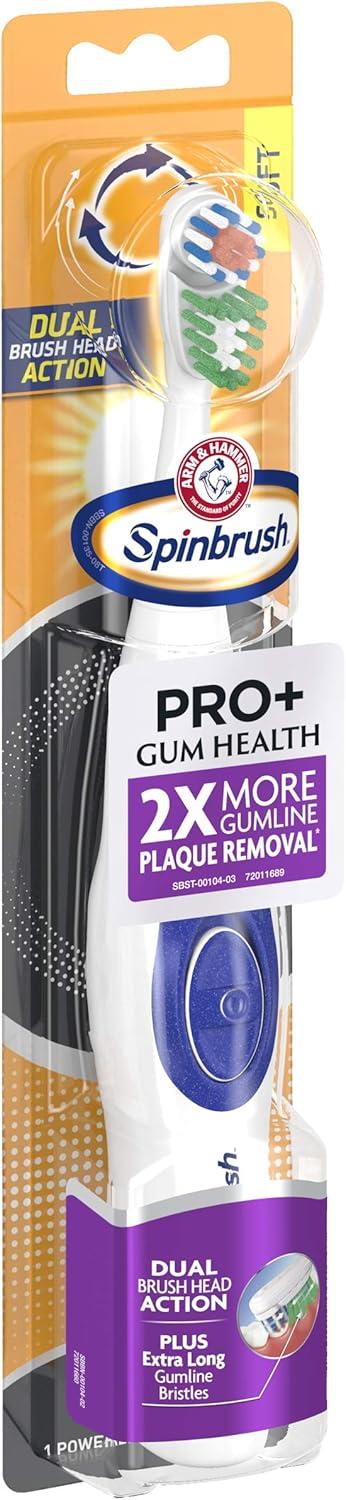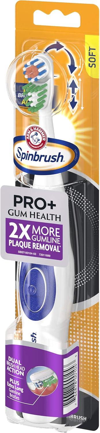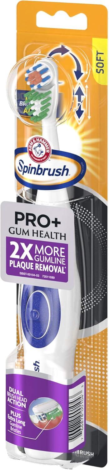 Take brushing to another level with Arm & Hammer Spinbrush PRO+ Gum Health Powered Toothbrush. This brush removes 2 times more gumline plaque.* The patented dual action technology combines a spinning head with extra long gumline bristles for greater access, in many of the hardest to reach areas.* Color-Wear bristles on this toothbrush bristles remind you to change your brush head every 3 months or when blue or green bristles on the spinning head fade. Includes one Arm & Hammer Spinbrush PRO+ Gum Health Powered Toothbrush. For clean and healthy teeth and gums, choose Arm & Hammer powered toothbrushes. Versatile and affordable. Gentle yet powerful. For generations of families, Arm & Hammer is the natural choice for taking care of every member of your family. Our toothbrushes, laundry, cat litter, toothpastes and personal care products deliver the quality you can count on, from the brand you trust. *Versus a manual toothbrush. Data on file.