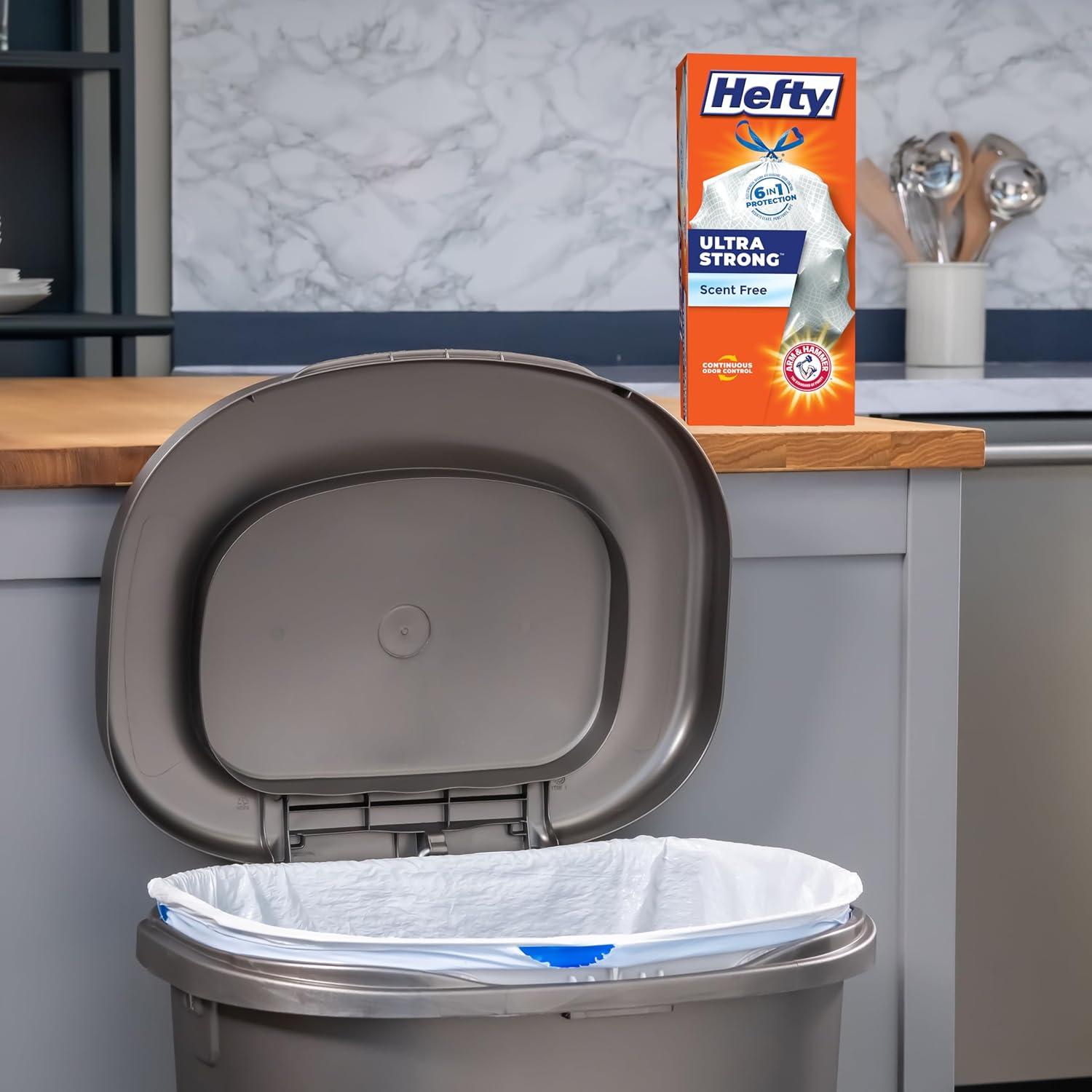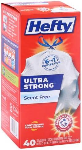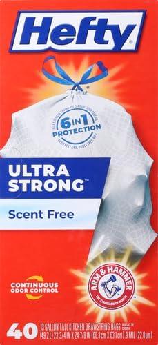 Hefty Ultra Strong 13 Gallon Trash Bags, Tall Kitchen Trash Bags 13 Gallon Size, Drawstring Closure, Continuous Odor Control, White, Unscented, 40 Bags(40 Count (Pack of 1))