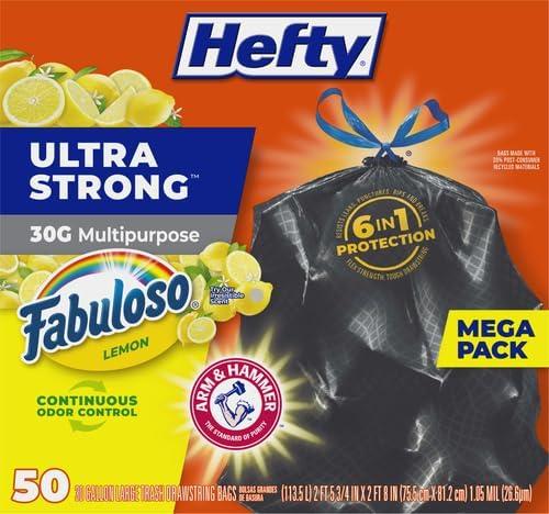 Hefty Ultra Strong 30 Gallon Trash Bags, Large Trash Bags 30 Gallon Size, Multipurpose, Break Resistant Drawstring Closure, Resists Leaks, Punctures, and Tears, Black, Fabuloso Scent, 50 Bags(multi-color)
