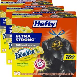 Hefty Ultra Strong 30 Gallon Trash Bags, Large Trash Bags 30 Gallon Size, Multipurpose, Break Resistant Drawstring Closure, Resists Leaks, Punctures, and Tears, Black, Fabuloso Lemon Scent, 50 Bags(50 Count (Pack of 3))
